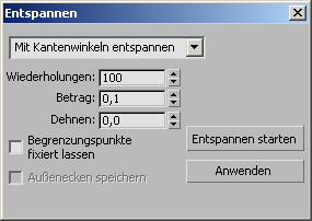 Das Dialogfeld bietet drei verschiedene Methoden zum Entspannen von Scheitelpunkten sowie mehrere numerische Parameter und zwei Kontrollkästchen. Mit dem Befehl "Entspannen" können Sie zu nahe nebeneinander liegende Texturscheitelpunkte trennen und Überschneidungen auflösen.