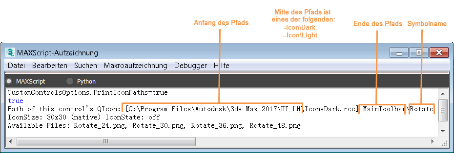 In dem obigen Beispiel lautet der gesamte Symbolpfad C:\Programme\Autodesk\3ds Max 2017\UI_LN\Icons\Dark\MainToolbar. Die Symboldatei heißt Rotate.png (und/oder Rotate_24.png, Rotate_30.png usw.).