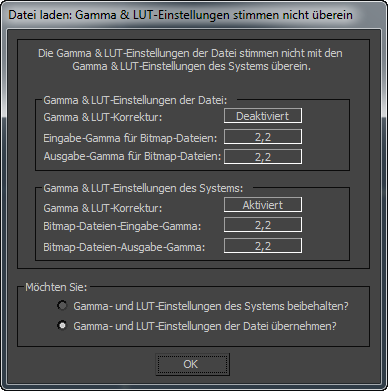 Die Korrektureinstellungen für Gamma und LUT werden mit den Marktvorgaben für die aktuelle benutzerdefinierte UI gespeichert. Siehe Umschalter zwischen Benutzer- und Standard-UI Wenn Sie eine Szene öffnen oder zusammenführen, deren Gamma- oder LUT-Einstellungen sich von den aktiven Einstellungen für 3ds Max unterscheiden, wird ein Dialogfeld angezeigt, in dem Sie auswählen können, ob Sie die aktuellen Einstellungen verwenden oder die aus der zu ladenden Datei übernehmen möchten. Beispiel: