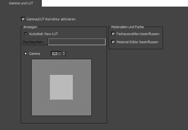 Die Anzeige-Gamma-Korrektur oder Nachschlagetabellen werden für das Ansichtsfenster und das Fenster für gerenderte Frames anzeigen angewendet. Mit den Steuerelementen in dieser Gruppe können Sie eine Autodesk View-LUT laden oder den Gammawert numerisch ändern.