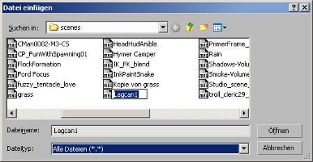 Über das Menü "Anwendung" "Importieren" fügen Sie Objekte aus anderen Programmen in eine Szene ein. Eine Liste der importierbaren Dateitypen finden Sie im Listenfeld "Dateityp" des Dialogfelds "Datei zum Importieren auswählen".
