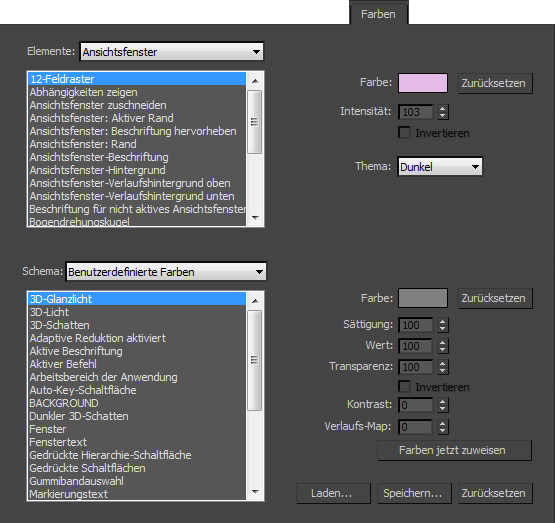 Auf der Registerkarte "Farben" des Dialogfelds "Benutzeroberfläche anpassen" können Sie das Aussehen der Benutzeroberfläche von 3ds Max anpassen. Dabei können Sie die Farben fast aller Elemente der Benutzeroberfläche einstellen und damit vollkommen frei Ihr eigenes unverwechselbares Layout entwerfen.