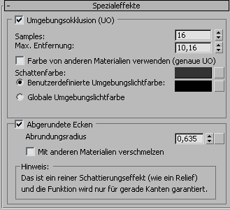 Stellt Einstellungen für Umgebungsokklusion (UO) und abgerundete Ecken und Kanten bereit.