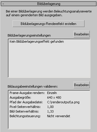 Bearbeiten Klicken Sie auf diese Option, um das Dialogfeld "Umgebung und Effekte" zu öffnen, in dem Sie die Einstellungen für die Bildüberlagerung bearbeiten können.