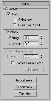 Zum Festlegen eines Netzobjekts, das die Käfigform definiert. Dabei handelt es sich in der Regel um ein Objekt, das mit der Option "Exportieren" erstellt (siehe unten) und danach mit Standard-Netzbearbeitungsverfahren modifiziert wurde. Nachdem Sie auf "Importieren" geklickt haben, wählen Sie das zu importierende Objekt aus. Nachdem Sie das Objekt importiert haben, weist der Käfig dieselbe Form auf. Anschließend können Sie das importierte Objekt nach Wunsch löschen.