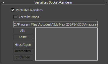 Die Steuerelemente dieses Rollouts dienen zum Einrichten und Verwalten von verteiltem Bucket-Rendern. Durch verteiltes Rendern können mehrere über ein Netzwerk verbundene Systeme gemeinsam an einem mental ray-Rendervorgang arbeiten. Buckets werden Systemen zugewiesen, sobald sie verfügbar werden.