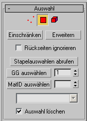 Das Rollout "Auswahl" des Modifikators "Projektion" dient zum Verwalten von Unterobjektauswahlen.