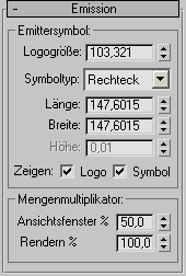 Hier können Sie die physikalischen Eigenschaften des Emittersymbols (der Partikelflussquelle) und den Prozentsatz der Partikel festlegen, die in den Ansichtsfenstern erzeugt oder gerendert werden.