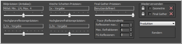 Diese zusätzliche Registerkarte wird unterhalb des Fensters für gerenderte Bilder angezeigt, wenn mental ray als aktiver Renderer eingestellt ist. Ermöglicht die bequeme Anpassung wichtiger Einstellungen im Zusammenhang mit Reflexion, Refraktion, Final Gather, und vielem mehr.