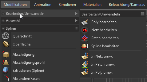 In dieser Teilansicht des Menüs Modifikatoren werden die Gruppen Bearbeiten/Umwandeln und Auswahl ausgeblendet und die Gruppe Spline erweitert.