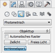 - Ändern Sie die Einstellung für das Sonnenlicht-Objekt in "mr-Sonne" und für das Himmelslicht-Objekt in "mr-Himmel". (siehe mental ray-Sonne und -Himmel)