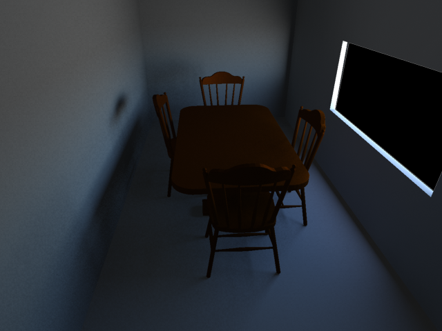 Durch mr-Himmelslichtportal erleuchtete Szene. Für Final Gather ist die Voreinstellung "Entwurf" aktiviert, keine Streufarbenreflexionen