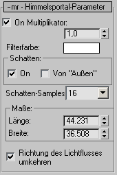 Das Objekt "mr (mental ray)-Himmelsportal" ermöglicht, auf effiziente Weise vorhandene, von oben einfallende Lichtquellen in Szenen in geschlossenen Räumen zu bündeln, ohne dass hohe Final Gather-Einstellungen oder globale Illuminationseinstellungen erforderlich sind, die zu extrem langen Renderzeiten führen würden. Ein Portal fungiert also als eine Flächenlichtquelle, die ihre Helligkeit und Färbung von der Umgebung ableitet.