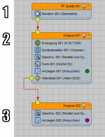 Jedes Ereignis kann mehrere Aktionen enthalten, die sich auf das Verhalten oder Aussehen von Partikeln auswirken können. Im Rahmen von Tests können Sie Partikel an andere Ereignisse senden, wenn die Partikel bestimmten Qualifikationen entsprechen. Eine einzelne Kette verknüpfter Ereignisse, wie in Partikelansicht beschrieben, wird als Fluss bezeichnet.