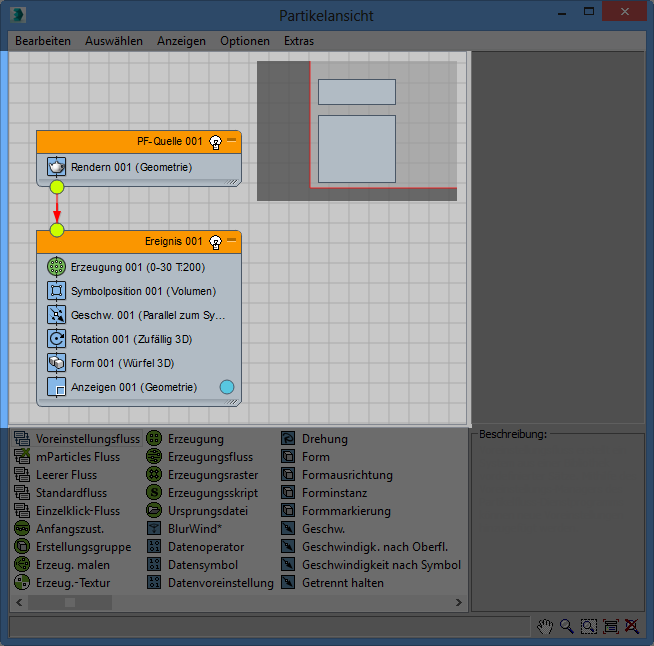 Die Ereignisanzeige, das Hauptfenster im Dialogfeld Partikelansicht, enthält das Partikeldiagramm. Hier erstellen und bearbeiten Sie das Partikelsystem.