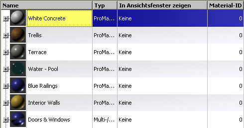 Im Hauptfenster des oberen Fensterbereichs "Szene" des Material-Explorers können sich mehrere Spalten mit Informationen zu den Materialien in der Szene befinden. Einige Spalten enthalten Zellen, die bearbeitet werden können.