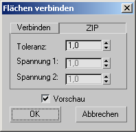 Ein Abstand in 3ds Max-Einheiten. Wenn die Kanten der beiden Ausgangsoberflächen näher zusammenliegen als dieser Abstand, wird durch eine Schnellverbindung eine Reihe (oder Spalte) der Punkte oder KS gelöscht, um zu verhindern, dass ein Punkt oder eine KS-Reihe (oder -Spalte) an gleicher Stelle auf der schnell verbundenen Oberfläche erstellt wird.