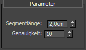 Legt die Länge der Spline-Segmente in 3ds Max-Einheiten fest. Die Positionen der ursprünglichen Scheitelpunkte werden verworfen, und für die Scheitelpunkte werden regelmäßige Abstände festgelegt. Mit der Segmentlänge wird definiert, wie viele Steuerpunkte hinzugefügt werden. Bei kürzeren Segmenten werden mehr Steuerpunkte verwendet und bei längeren Segmenten weniger. Vorgabe = 20,0 Einheiten.