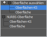 Mit Oberfläche auswählen kann die Auswahl aus Oberflächen-KS oder Oberflächen-Unterobjekten bestehen. Wenn Sie die Option "Relationaler Stapel" für das NURBS-Objekt aktivieren, können Sie auch Punkt-, Kurven- und Kurven-KS-Unterobjekte auswählen.
