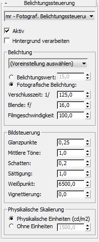 Mit der mr - Fotograf. Belichtungssteuerung können Sie die gerenderte Ausgabe mit kameraähnlichen Steuerelementen, wie Verschlusszeit, Blende und Filmempfindlichkeitseinstellungen, ändern. Sie haben auch Bildsteuerungsmöglichkeiten, z. B. Einstellung getrennter Werte für Glanzlichter, mittlere Töne und Schatten. Dies funktioniert nur mit dem mental ray-Renderer.