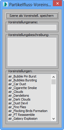 - Speichert die aktuelle Szene als Voreinstellung. Die Voreinstellung wird als Dateipaar gespeichert: Voreinstellungsname.txt mit der Beschreibung der Voreinstellung und Voreinstellungsname.max mit Szene selbst. Beide Dateien werden unter /plugcfg/particle flow presets/ im Installationsordner gespeichert. Da Voreinstellungen als Dateien gespeichert werden, können Sie Voreinstellungen durch Manipulation der Dateien austauschen oder ändern.