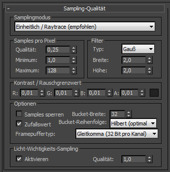 Die Qualität legt im Wesentlichen die "Rauschstufe" fest, bei der der Renderer das Sampling einstellt. Höhere Qualität bedeutet weniger Rauschen. Der räumliche Kontrastgrenzwert legt die niedrigste Stufe des zulässigen Rauschens fest.