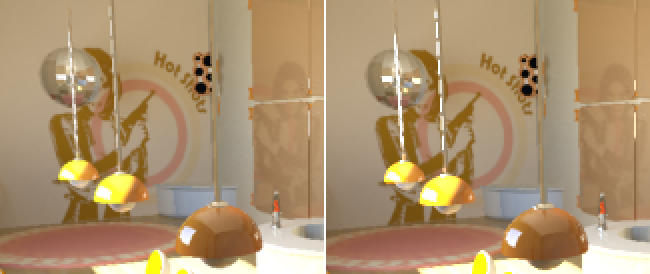 Rechts: Bei einem 32-Bit-Rendering sind helle Glanzlichter (auf den Lampen und im Spiegel) stark und gezackt.