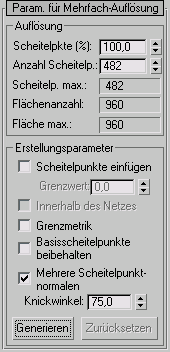 Welcher Knickwinkel optimal ist, hängt vom jeweiligen Modell ab; stellen Sie ihn am besten interaktiv ein, und prüfen Sie im Ansichtsfenster und in den gerenderten Bildern die resultierenden Schattierungseffekte. Die Option "Mehrere Scheitelpunkt-Normalen" liefert zwar eine stärkere Schattierung, möglicherweise sind aber auch mehr interne Daten erforderlich.