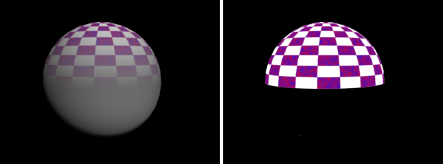 Die folgende Abbildung zeigt das in der vorstehenden Vorgehensweise beschriebene Beispiel. In der linken Abbildung sehen Sie das vollständige Material mit dem Rauschen innerhalb des Schachbretts, das sich im Verlauf befindet, und in der rechten Abbildung ist ein beschriftetes Element dargestellt, das nur das Rauschen innerhalb des Schachbretts enthält. Das Element rendert nur den Teil der Schachbrett-Map, der von der Verlaufs-Map verwendet wird.