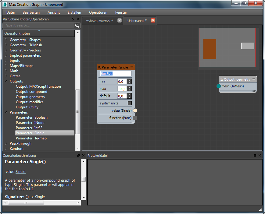Die Parameter werden in der Benutzeroberfläche des Ausgabediagramms angezeigt (in diesem Fall mit der Bezeichnung BoxSize). Somit haben Personen, die Ihr Diagramm verwenden, die Möglichkeit Werten in der Benutzeroberfläche einzugeben. Der Parameter: Mit einem einzelnen Knoten kann der Benutzer eine Gleitkommazahl mit einfacher Genauigkeit festlegen, d. h. einen Dezimalbruch. Als Ersteller des Diagramms können Sie auch die Benutzereingabe auf einen bestimmten Bereich an Werten eingrenzen und einen Vorgabewert eingeben.