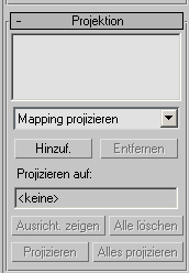 Sie können ein Projektor-Plug-In auswählen. Nur ein Projektor, "Mapping projizieren", gehört zum Lieferumfang von 3ds Max. Siehe Rollout Mapping projizieren (Modifikator Projektion) Weitere Projektoren können unter Umständen von Drittanbietern bezogen werden.
