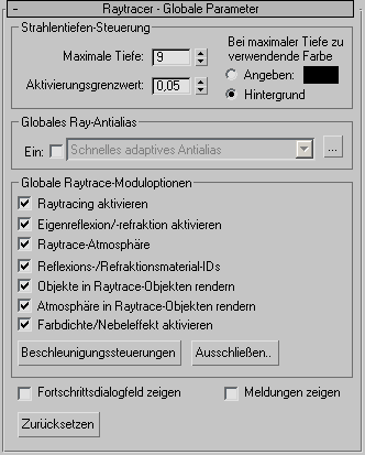 Anmerkung: Mit diesen Steuerelementen können Raytracer-Einstellungen nur für den Scanline-Renderer eingestellt werden. Die aktuelle Einstellung dieser Steuerelemente hat keine Auswirkung auf den mental ray-Renderer. Dieser besitzt für das Raytracing seine eigenen Steuerelemente.