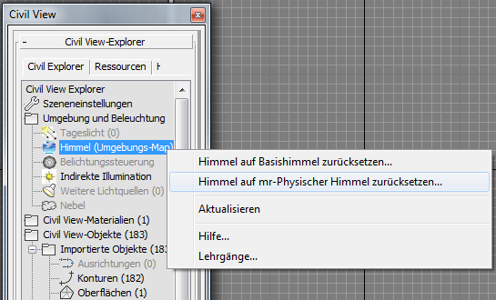 Sie können den Himmel auch zurücksetzen (oder zum mental-ray-basierten mr-Physischer Himmel wechseln), indem Sie mit der rechten Maustaste in der oberen Civil View-Explorer-Gruppe auf den Eintrag Himmel (Umgebungs- Map) klicken.