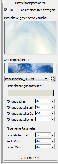 Die Himmeltextur wird automatisch in jede neue Szene geladen. Wenn Sie viel Erfahrung mit 3ds Max haben, können Sie Himmeltexturen selbst erstellen, wodurch alle Steuerelemente in diesem Rollout deaktiviert werden.