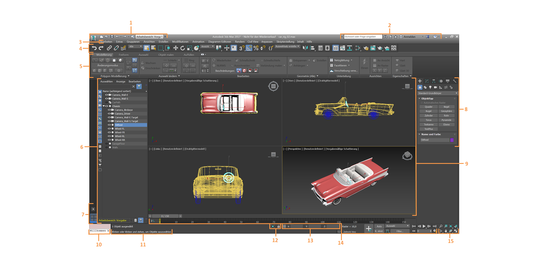 Die Benutzeroberfläche von 3ds Max umfasst Steuerelemente, Statusinformationen und Ansichtsfenster, in denen Sie Ihre Szene bearbeiten und anzeigen können.