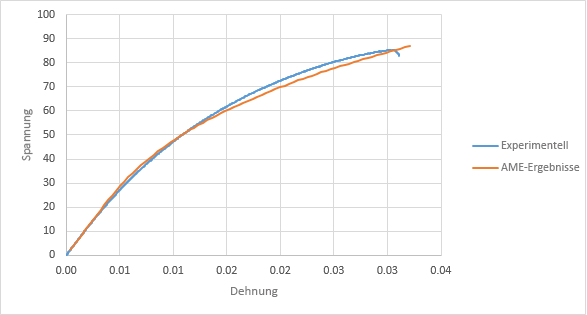 Wir können eine sehr gute Übereinstimmung zwischen den experimentellen Daten bei 0 Grad und den Ausgaben aus Advanced Material Exchange feststellen. Beachten Sie, dass Advanced Material Exchange ein spannungsbasiertes Ausfallkriterium verwendet, sodass die Tatsache, dass wir eine sehr ähnliche Bruchgrenze für jede Kurve erhalten, darauf vertrauen lässt, dass das Werkzeug zuverlässig verwendet werden kann.
