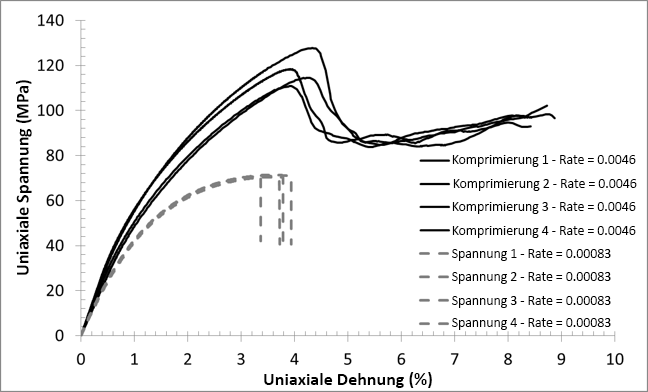 Wir sehen, dass die Zuglast zu einer höheren Geschwindigkeit der Plastizitätsentwicklung als die Drucklast führt (dies gilt auch, wenn die Reaktion auf Zug mit einer höheren Dehnungsrate erfasst wird). Dies bedeutet, dass das Material bei einer vorgegebenen Dehnungsstufe eine größere Reduzierung des tangentialen Moduls aufweist, wenn der Spannungszustand durch die Spannung dominiert wird, im Gegensatz zu einer druckdominierten Spannung.