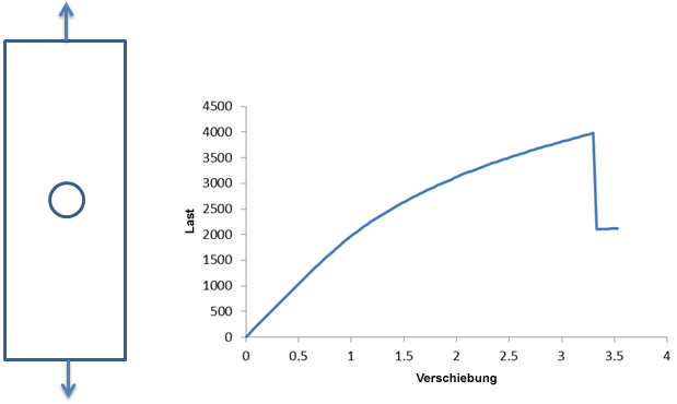 Betrachten Sie die unten gezeigte Darstellung eines zugbelasteten Prüfstückabschnitts, der aus einer spritzgegossenen Platte hergestellt wurde. Zur Bestimmung des Punkts im Belastungsverlauf, an dem der endgültige Ausfall auftrat, muss eine Last-Verschiebung-Kurve erstellt werden. Durch Addition der Reaktionskräfte an allen belasteten Knoten kann die unten gezeigte Last-Verschiebung-Darstellung generiert werden. Ab einer Verschiebung von 1 lässt sich ein beträchtliches Ausmaß von in die Struktur eingeführter Plastizität feststellen. Die plastische Verformung setzt sich fort bis zu einem großen Belastungsabfall bei einer Verschiebung von ungefähr 3,25. Dieser plötzliche Lastabfall verweist auf einen schwerwiegenden Ausfall der Struktur.