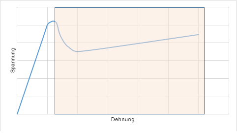 Das Materialmodell in Advanced Material Exchange eignet sich am besten für Materialien, bei denen Versagen bei relativ geringer Dehnung erfolgt. Sehr verformbare Materialien werden mit dem vorhandenen Materialmodell nicht besonders gut dargestellt. Advanced Material Exchange berücksichtigt bei der Materialcharakterisierung den Bereich über die maximale Spannung hinaus nicht. Dieser wird in der Darstellung oben als schattierter Bereich dargestellt.
