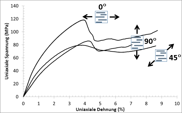 Mit dem aktuellen Modell erzielen Sie mit drei Zugtests bis zum Ausfall gute Anpassungsergebnisse. Das folgende Bild zeigt so eine Sammlung von Zugtests. Es enthält Zuglastdaten in drei verschiedene Richtungen, die relativ zur durchschnittlichen Faserrichtung eines fast vollkommen ausgerichteten Materials verlaufen. In den Zugtests sind 0°-, 45°- und 90°-Zugproben enthalten. Alle Zugproben werden so lange belastet, bis sie schlussendlich brechen.