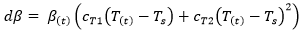 η ist der Stärkereduktionsfaktor, der an jedem Punkt auf der Oberfläche berechnet wird. Ts ist die Erstarrungstemperatur und T(t) ist die Temperatur über die Zeit hinweg wie in der WS3-Datei definiert. Die Koeffizienten cT1 und cT2 stellen die zwei Stärkekoeffizienten der Bindenähte dar, die mit der Moldflow Material-UDB-Datei verknüpft sind. θc ist der kritische Winkel (Phi Kritisch in Moldflow). θ ist der Winkel, in dem konvergierenden Fließfronten aufeinander treffen.