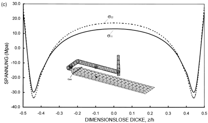 Um diese Spannungsfelder zu vergleichen, wurde zunächst ein rechteckiges Bauteil erstellt. Anschließend wurde die von Helius PFA prognostizierte Spannungsverteilung in Flussrichtung unter Verwendung der nicht mechanischen Dehnungen aus Moldflow untersucht. Die Abbildung unten zeigt einen Querschnitt des Bauteils sowie das prognostizierte Spannungsfeld. In der Abbildung unten rechts wird die von Zheng [15] erstellte überlagerte Kurve in Gelb und die von Helius PFA prognostizierte Kurve in Weiß dargestellt. Diese Kurven repräsentieren das Spannungsfeld für das unabhängige, verzogene Bauteil, ohne externe Belastungen.