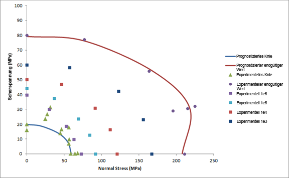 Die Werte für A I werden mithilfe von drei Tests für statisches Verbundmaterial-Versagen ermittelt: längsseitige Spannung, längsseitiger Druck und Scherung in der Ebene. Die in Gleichung 47 angeführten Ausfallkriterien wurden anhand von experimentellen Daten überprüft. Die Ergebnisse sind in der Grafik unten als "Predicted Ultimate" zu sehen.