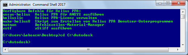 - Öffnen Sie die Befehlsshell von Helius PFA 2017, indem Sie auf das Desktop-Symbol klicken (oder über Start > Autodesk > Autodesk Helius PFA 2017 > Command Shell 2017).