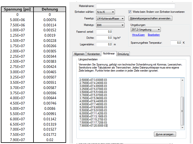Durch Klicken auf die Schaltfläche "Kurve anzeigen" können Sie umgehend überprüfen, ob die Spannung-Dehnungs-Daten korrekt eingegeben wurden. Als Folge wird das Diagramm unten angezeigt.