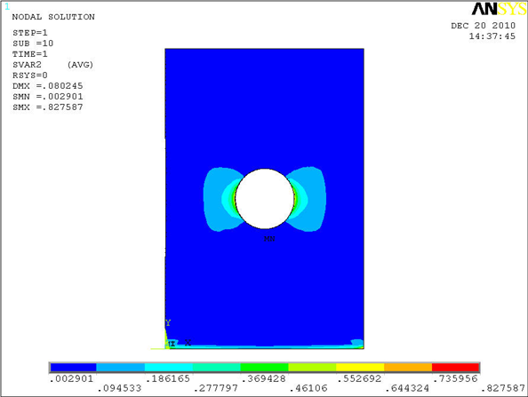 Die Zustandsvariable SVAR2 steht für den Matrix-Fehlerindex für das Verbundmaterial und ist ein Indikator, der angibt, wie nahe die Matrix daran ist zu versagen. Wenn SVAR2 einen Wert größer als oder gleich 1 hat, ist das Kriterium für den Matrixausfall erfüllt und der Matrixausfall wird prognostiziert. Zur grafischen Darstellung dieser Variablen können die Befehle PLESOL oder PLNSOL verwendet werden. Das PLESOL-Konturdiagramm mittelt die Werte nicht über Elementgrenzen hinweg, während das PLNSOL-Konturdiagramm Durchschnittswerte über Elementgrenzen hinweg verwendet. Da die Werte von SVAR2 stufenlos statt diskret sind, ist das PLNSOL-Diagramm das nützlichere.