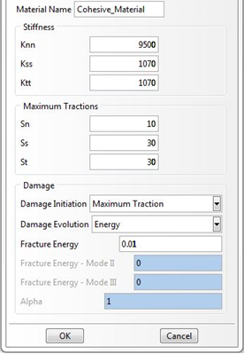 Es gibt viele verschiedene Ansätze zur Bestimmung kohäsiver Materialeigenschaften. Die folgenden Eigenschaften dienen lediglich Demonstrationszwecken. Eine umfassende Beschreibung ihrer Bestimmung würde den Rahmen dieses Dokuments sprengen. Eine ausführliche Beschreibung kohäsiver Eigenschaften und eine empfohlene Methode zur Bestimmung ihrer Werte finden Sie im Abschnitt Energiebasierte Materialdegradation des Theoriehandbuchs.