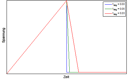 Hierbei sind ti, tf und tdeg jeweils die aktuelle Zeit, die Zeit bei Ausfallsbeginn und der Zerfallszeitraum (Benutzer-Materialkonstante 11). Die Abbildung unten zeigt die lokale Materialreaktion als Zeitfunktion für verschiedene Werte des Zerfallszeitraums (konstante Dehnung nach Ausfallsbeginn).