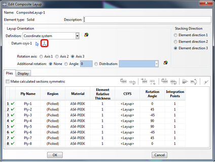 Geben Sie die Werte 0, 45, 45, 90, 90, 45, 45, 0 als Drehwinkel (Rotation Angle) für die Lagen Ply-1 bis Ply-8 ein. Das Dialogfeld sollte wie unten dargestellt angezeigt werden.