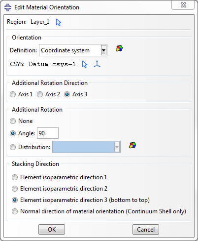 - Wählen Sie im Dialogfeld Edit Material Orientation die Option Axis 3, geben Sie dann einen Winkel von 90 Grad ein, und klicken Sie auf OK. Dadurch drehen Sie das Material um 90 Grad um die Z-Achse des Koordinatensystems.
